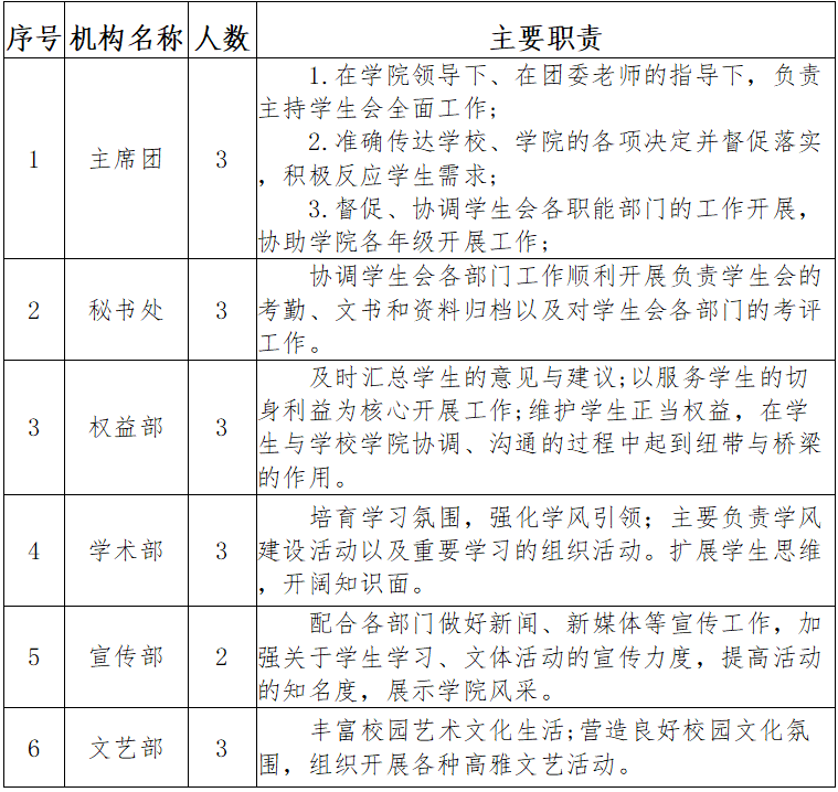 (3)学术部:设部长1名,副部长2名,部门职责为:负责策划组织学术讲座、专业知识竞赛、学术研讨会等活动,营造优良学风,整合推送学术资讯,配合学校开展学术交流活动,提升学生学术素养。