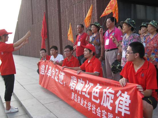 实践分队一行六人到达孟良崮战争遗址,与工作人员协调之后队员们进入了烈士陵园。听工作人员讲述,当时虽然我军获胜,但付出了极大的牺牲。大崮顶上曾尸横遍野,烈士们为新中国的的诞生贡献了自己才华横溢的青春和生命,愿逝去的英灵在这庄严肃穆的陵园内得以安眠。在粟裕将军墓前同学们向墓碑三鞠躬,缅怀这位革命英雄。参观中队员们深刻体会到“小米加步枪”,“手推车推出的胜利”的艰苦奋斗的革命精神。在这曾经见证过硝烟战火的革命圣地,同学们想象战争当时部队冒着枪林弹雨夺取高地的豪迈壮阔,不禁为革命烈士感动不已。参观结束后,队员们与同时进行参观的淄博老年党员旅游团沟通,向纪念馆负责人借来音响,组织这些爷爷奶奶们一起唱响了红色歌曲,《没有共产党就没有新中国》、《打靶归来》,一首首动人的旋律响彻革命圣地。首日的活动也在这高亢的歌声中宣告结束。