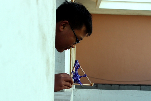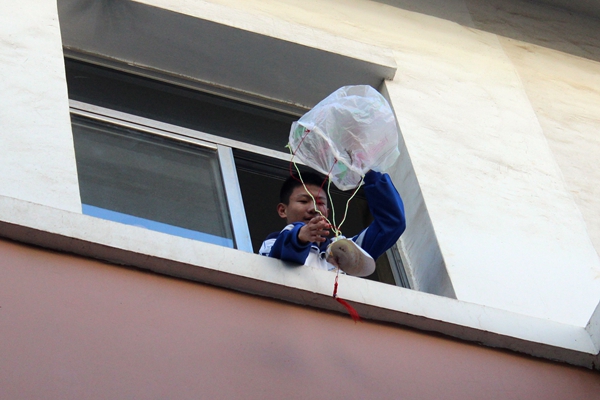 比赛开始之前,实践部副部长王瑜向同学们宣读比赛规则:同学们自行设计保护装置,生鸡蛋在装置的保护下由教学楼三楼抛到地面,在蛋壳不破裂的前提下,整个作品质量越轻、着陆越准确、外观设计越新颖,得分越高。为了保护鸡蛋,有的小组用气球、塑料袋增大空气阻力,以降低鸡蛋撞击地球的速度;有的则将鸡蛋固定在三脚架中间,来避免鸡蛋和地面的直接接触。同学们拿着精心设计的鸡蛋保护装置,自信地将鸡蛋从三楼撞向地球。其中,崔宇聪凭借简洁美观的设计和临场的准确投掷,以97的高分获得本次比赛第一名。