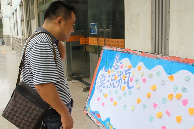 参加活动的同学在“趣味猎狐赛”活动中找到发射源之后,拿到发射源下面的便利贴,返回工程楼,将自己的梦想写在便利贴上,贴在队员事先为他们准备的展板上。