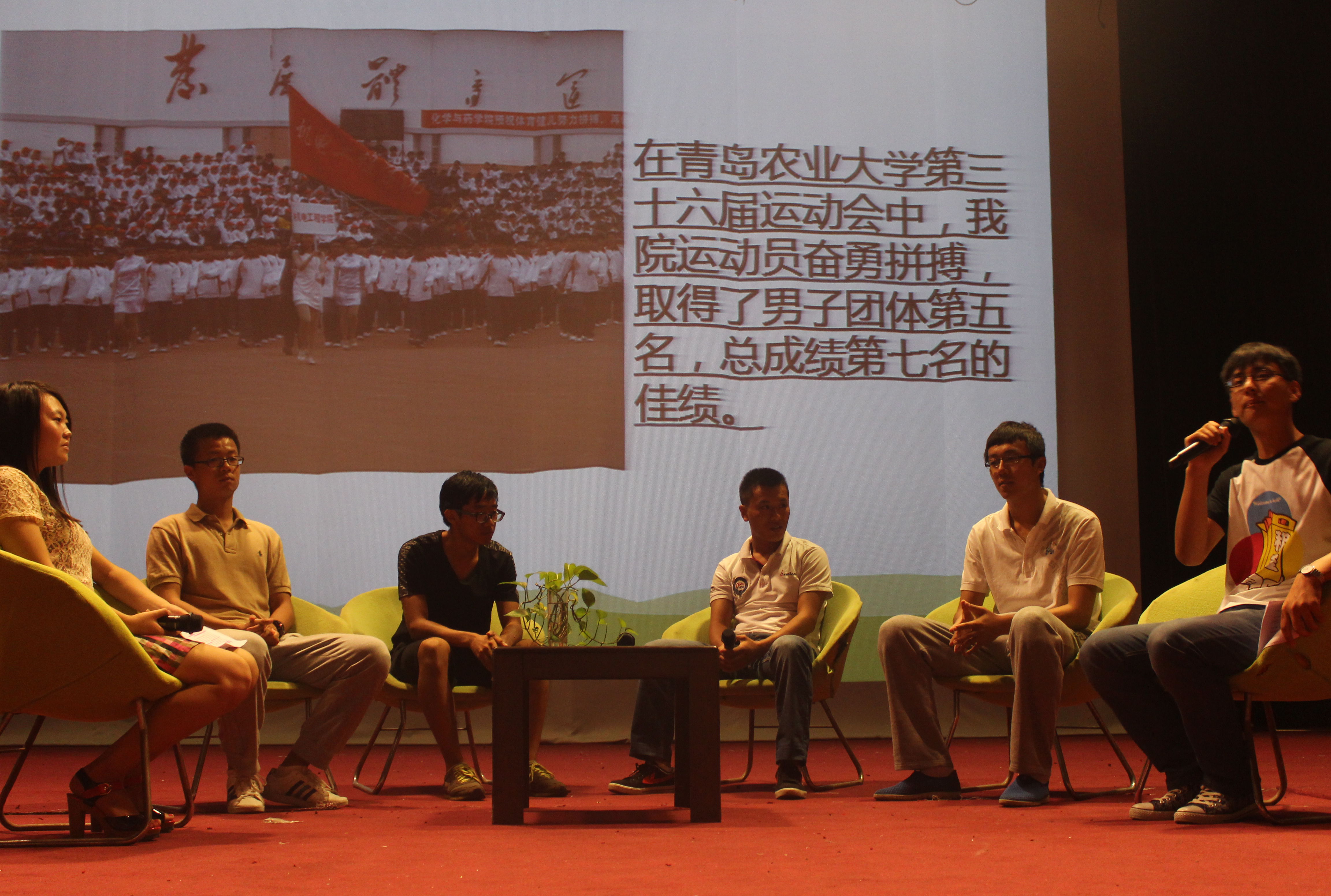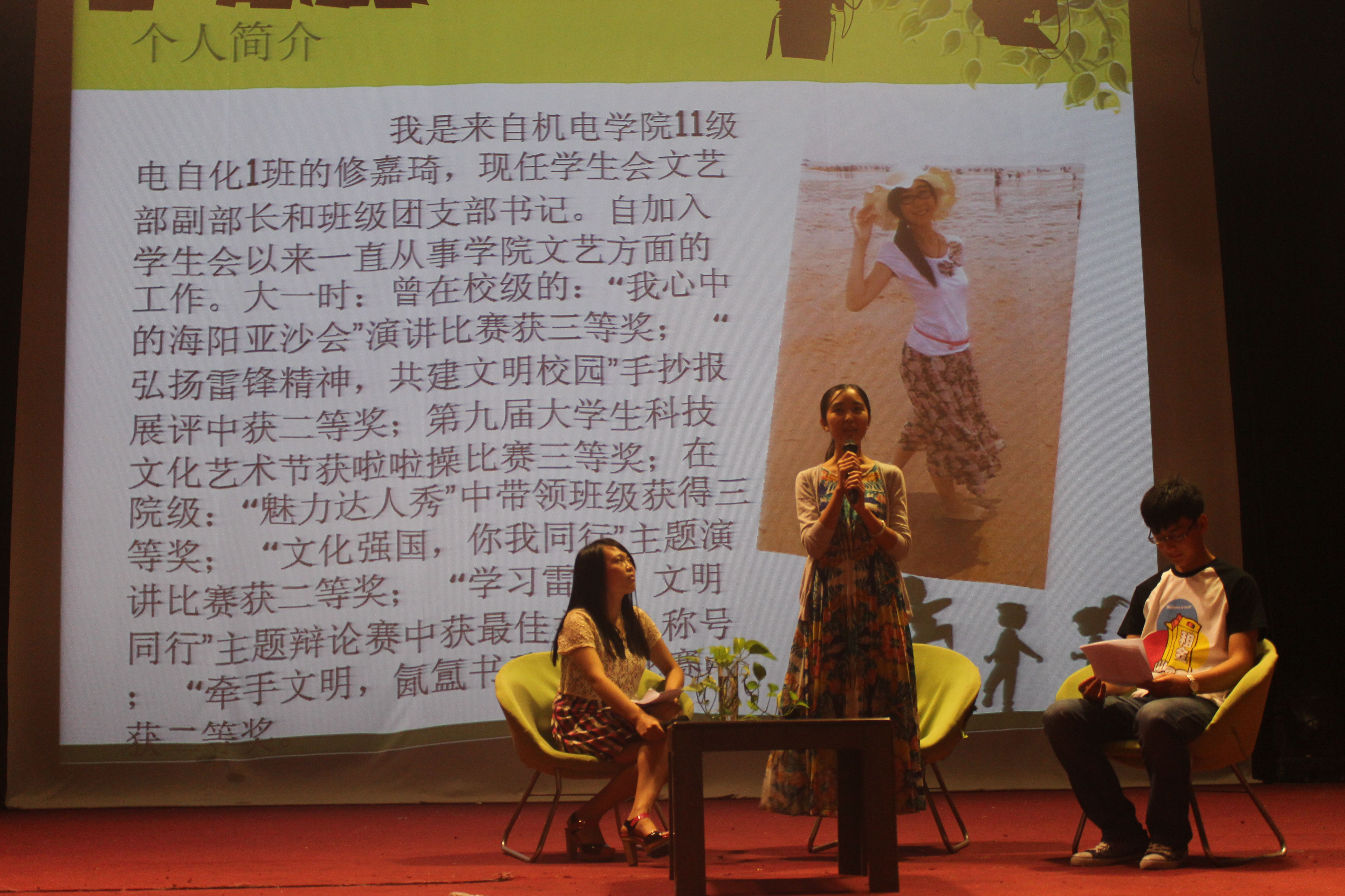 主持人首先访问了学院学习标兵——来自10级的张新迪和11级的程龙。两位同学与大家共同分享在学习方面的心得和体会,他们谈到学习要渗透在大学生活的每一个方面,要从高中的“要我学”的学习方式转变到“我要学”的学习方式,在学习中寻找乐趣;修嘉琦同学与大家分享自己在大学这两年从事文艺工作的成长与收获,如何通过文艺活动鼓舞人心、凝聚力量,在谈到在创作、排练过程中如何经历磨难学会了坚强与担当时,现场响起了热烈的掌声;作为我院体育活动的骄子——“足球小王子”王鹏,“百米飞人”张建,“万米哥”任勇豹还有“体育全能”王梓臣一出场就赢得了热烈的掌声。大家侃侃而谈,与新生同学讲述了自己在体育方面的付出和收获。当提到各自参加的赛事以及取得的成绩时,新生同学无不为之惊叹,也为机电学院在体育方面能取得的优秀成绩而感到骄傲。在被问到在体育方面如此突出的原因时,他们都提到后天的努力锻炼是不可或缺的的因素。作为学生科技创新的尖兵,郭亭亭同学早已手握四项国家专利,并在全国电子设计大赛、山东省机电产品创新大赛等赛事中获得了诸多省级荣誉,看着 ppt上展示的以郭亭亭同学为代表的同学所获得的奖项和专利,在座的每位同学都惊叹不已。郭亭亭在访谈中谈到科技创新最重要的是兴趣和合作,同时也需要投入大量的精力时间,希望新生同学充分利用学院良好的科技创新平台,在科技创新中锻炼自我,培养综合素质,提高就业竞争力。