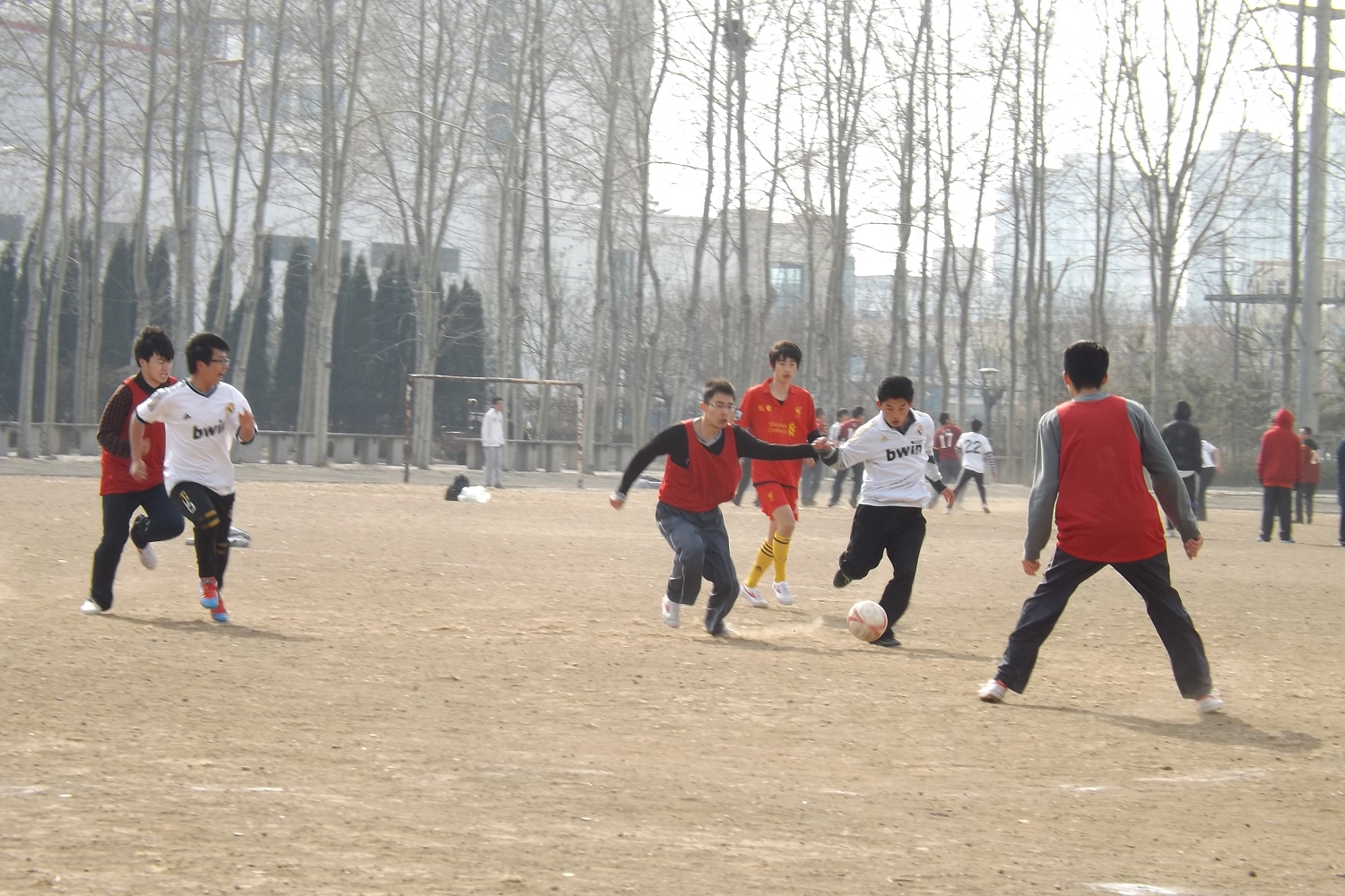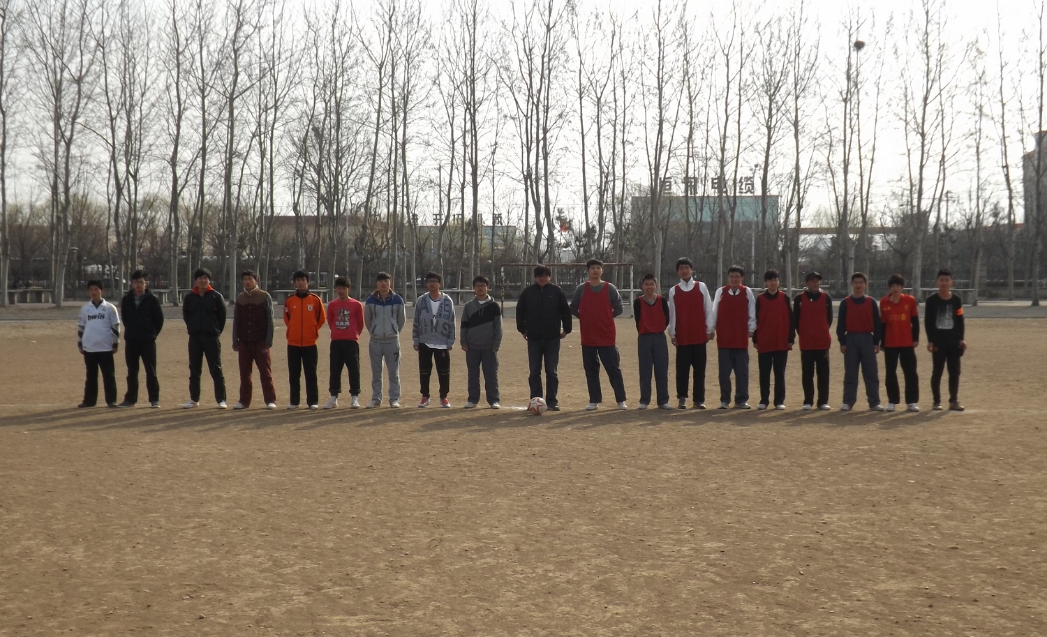 在比赛上半场开场十分钟左右,奋斗队率先破门,就此拉开进攻的序幕。在多次猛烈进攻的逼迫下,靖海队的后防线几近崩溃,但是他们坚持着,全场积极回防,严逼对方进攻队员,在上半场快结束时,奋斗队以1:0暂时领先。中场休息时,两队积极总结经验,完善进攻防守战术,特别是落后的靖海队,队员们相互鼓励,大家破釜沉舟做好了背水一战的准备。下半场靖海队果真士气大增,跑位、挡拆、长传、带球、射门,终于,球进了,全场欢呼,一条流畅的进攻,靖海队扳回一球。随后两队都有几次有效的进攻,可谁都没有撕开对方的球门,最后双方进行了点球大战,经过一系列的点球,奋斗队3:2领先,最后以总比分4:3 险胜靖海队。寒风凛冽,却丝毫挡不住参赛同学的热情;灰尘漫天,却掩饰不住场下观众的激动。无畏输赢,同学们的凝聚力是不变的。