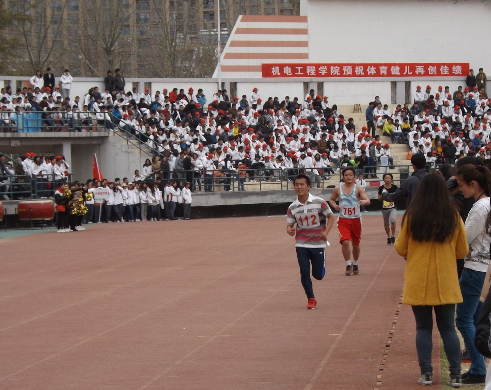 比赛刚开始,运动员们势均力敌,我院选手任勇豹并未显示出明显的优势,一万米是一个非常考研运动员耐力和毅力的项目。在角逐了七八圈之后,在其他运动员开始心有余而力不足之际我院运动员任勇豹依旧保持着稳定的速度,步履稳健,英姿飒爽。看台上的我院同学更是心潮澎湃,掌声雷动,呐喊声助威声此起彼伏。当跑到最后一圈时,任勇豹高举我院院牌,一路健步勇夺第一。