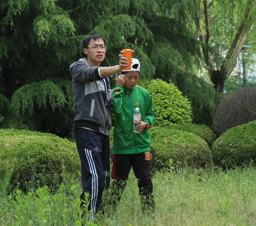 随后,“无线电测向大赛”正式开始。本次“猎狐”无线电测向大赛以团队找到信号源并回到出发点所用时间长短评判成绩,采用三至四人一个团队的形式,每个队伍中都有一名实验二小的小学生。一声令下,参赛队员们手持测向机,根据信号源的声波定位方向。大家密切合作,且停且行,时而驻足倾听信号,时而低头寻找。不放过每一处草丛,每一个岩石缝隙。大家体味着运动的乐趣,考验着自己的耐力和体力,与时间赛跑,乐在其中。