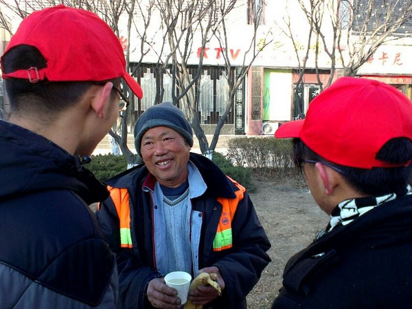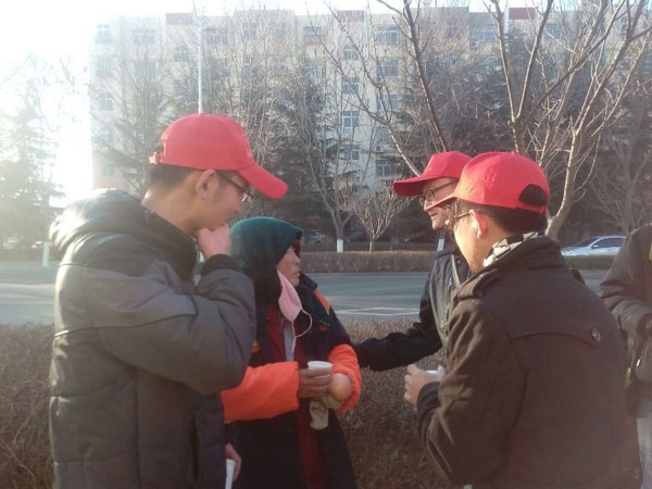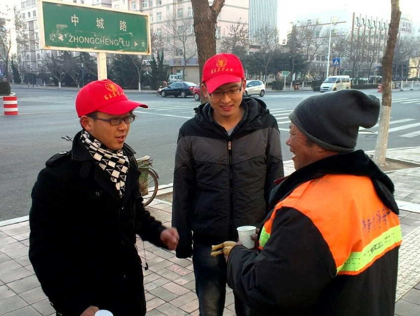 1月4日,机电工程学院农机化1302团支部组织志愿者开展了“为环卫工人暖暖心”社会实践活动。同学们向环卫工人送上问候,献上一杯热茶,感谢他们为城阳区优美、洁净的市容环境所付出的辛勤劳动。