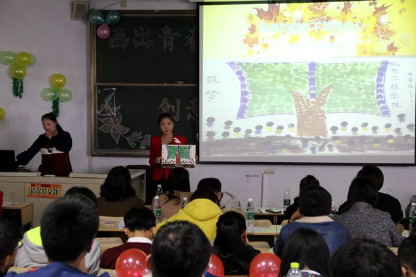 活动开始,主持人潘帅、房薪公布初赛结果,共有30个作品从初赛中脱颖而出,入选了今天的决赛,其中机电学院共有9个作品入选。首先,化药学院以视频的形式展示了各个作品。接下来,各参赛代表依次介绍自己的作品,《初秋》、《樱》、《心花》等一个个作品充满青春的活力和创意。选手谢玉婷的《鹰击长空》让在场观众赞叹不已,而她的一句“泰山压顶不弯腰,惊涛骇浪不低头”更是赢得一片掌声。参赛选手胡岽华说:“与其说团结让我们完成了作品,不如说作品让我们更加深了友谊。”活动期间,机电学院陈太艳带来的精彩舞蹈《三寸学堂》让在场观众热情高涨,而化药学院学生歌手演唱的三首歌曲也让现场气氛更加活跃。
