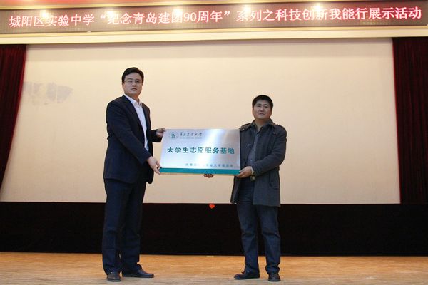 11月14日上午,青岛市城阳区实验中学2013年科技节暨知识产权宣传教育活动表彰大会在该校大礼堂召开。我校团委副书记王峰,我院党委副书记孙景福、团委书记孙晓凤出席了该会议。大会过程中,我校团委副书记王峰给城阳区实验中学授予“大学生志愿服务基地”牌匾。