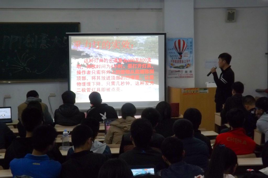 11月2日晚上7点,我院科技创新部举办的奇思妙想ppt创意设计决赛在教学楼c309激情上演。 本次比赛由副部郭明晖主持,我院学生会副主席王元,体育部部长王彬、秘书处于浩担任评委。