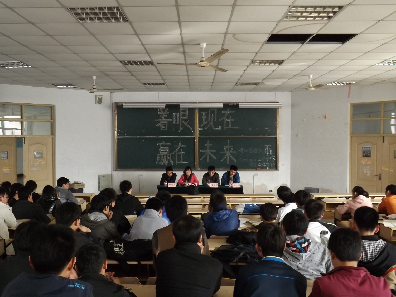 为帮助2010级考研学生进一步明确考研目标,坚定考研信心,并浓厚学院的考研氛围。4月14号下午,我院学生会学习部在教学楼D303,D304教室举行考研经验交流会。本次交流会有幸邀请到了今年考研成绩比较突出的几位学长、学姐:赵骞、董昌华、张国伟、冯鑫、樊志鹏、孔彬、李嫚嫚,与同学们进行经验交流。