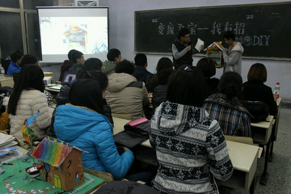 12月8日,由机电工程学院科技创新部举办的变废为宝创意DIY比赛在教学楼c103激情上演。学生会主席李新勇,舍管部部长王园等应邀担任了本次比赛评委。赛前,科创部为同学们进行了一系列关于如何变废为宝的培训会,让他们对于环保有了更深刻的认识。
