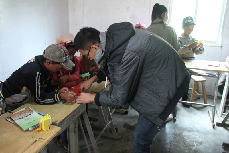 首先队员将叠好的百合花,小青蛙,纸飞机,爱心等折纸作品展示给孩子们,在他们的要求下,队员魏亚男耐心的教授给孩子们如何叠百合花,当孩子们都成功叠出后,他们拿着成型的百合花说:"很漂亮"。而后队员常增村也带领孩子们叠出了五颜六色的飞机,孩子们一起来到教室外,放飞纸飞机。五彩纸飞机飞在空中,孩子们全都露出了开心的笑脸。"我飞的高,我飞的高!"孩子们不服输的比着赛,争着将纸飞机飞的越来越高。