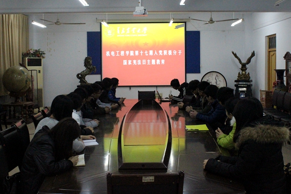 12月4日是第二个国家宪法日,为深入宣传以宪法为核心的法律制度,增强同学们的宪法意识,机电工程学院积极响应学校要求,于12月6日在工程楼216开展国家宪法日主题教育活动,活动由预备党员常增村主持,机电工程学院第十七期入党积极分子参加了本次活动。