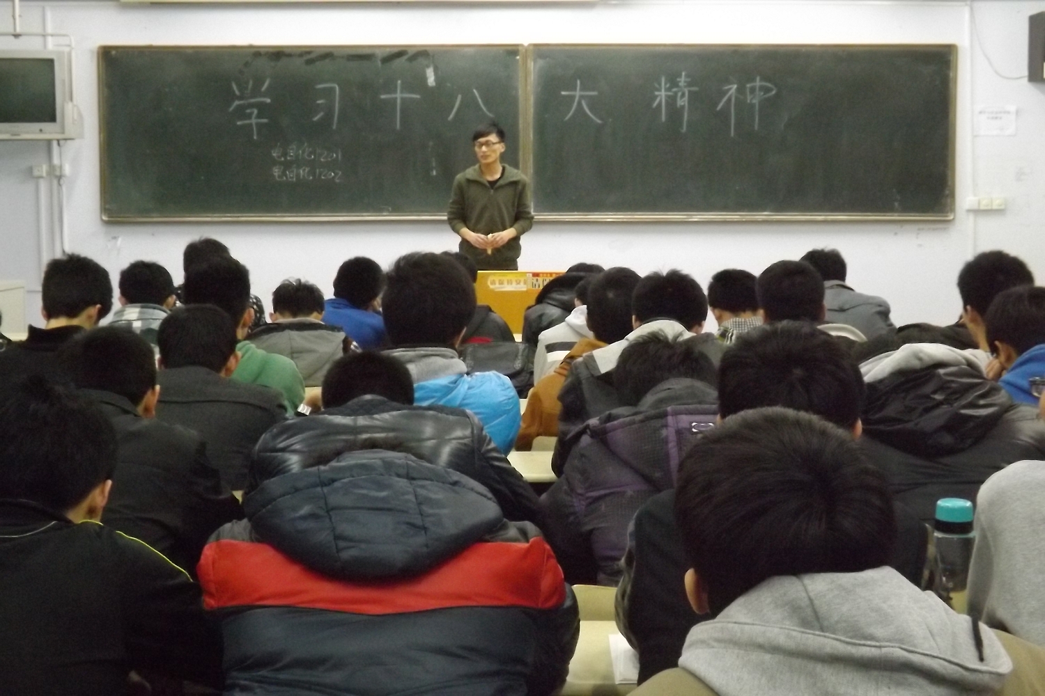 首先,各班团支书作《关于党的十八大》专题报告,并带领同学们认真学习了十八大报告;同时结合当下的大学生生活对十八大精神进行了深入解读。随后,团支书就各自班级存在的问题提出意见和解决方法,从实践角度出发,贯彻学习十八大精神。其间,同学们认真摘记笔记并积极发言,提出许多热点话题,将团课氛围推向高潮。