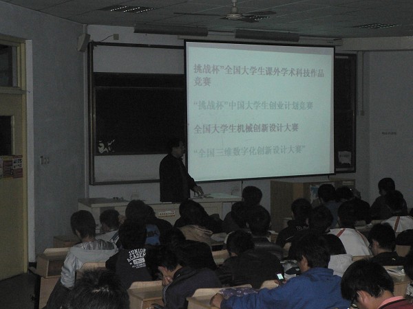 本次讲座,周建强教授用风趣幽默的语言,为我院10级新生做了科技创新的讲座。周老师用PPT先介绍了自行车的发展历史,引出了创新的重要性,然后给我院10级新生讲解了我院学生应该努力参加的大赛,如“挑战杯”全国大学生科技产品创新大赛,“挑战杯”中国大学生创业计划大赛等,并介绍了我院的获奖情况,鼓励大家积极创新,去参加比赛,获得不断地提高。