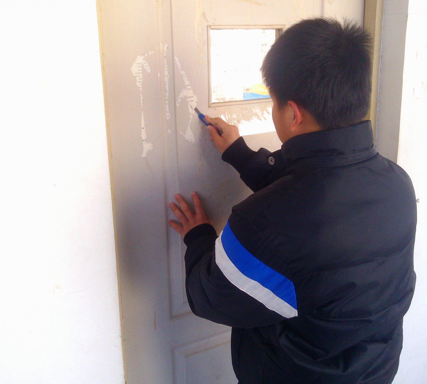 中午,同学们兴致高昂地来到清理现场,大家合理分工,密切配合。墙壁、桌面、角落……每一个细节之处都不放过。大家用小刀一点点地刮,用湿抹布努力地擦。遇到粘的很结实的广告纸,同学们便一遍遍的用各种方法尝试,直至完全清除干净。虽然天气寒冷,但同学们都干得热火朝天;虽然很累,但看到自己的战绩,大家心里都充溢着满足与快乐。