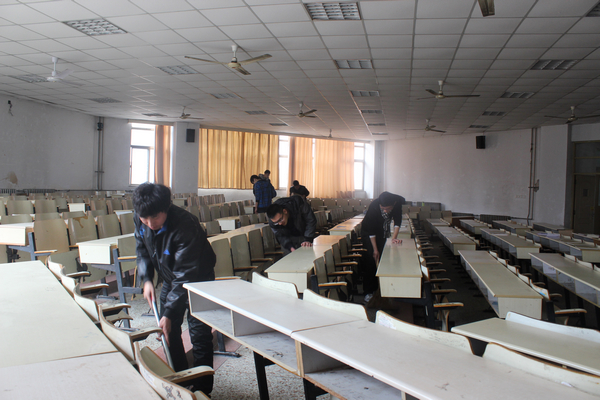 上午放学后,学生会及新闻宣传中心成员按原计划,带着卫生工具来到了教学区D区,顾不上太多的寒暄,便投身劳动中。整个活动过程中,大家的情绪都很高涨,门窗,门框,玻璃,讲台,就连桌洞的死角大家都清理的干干净净。