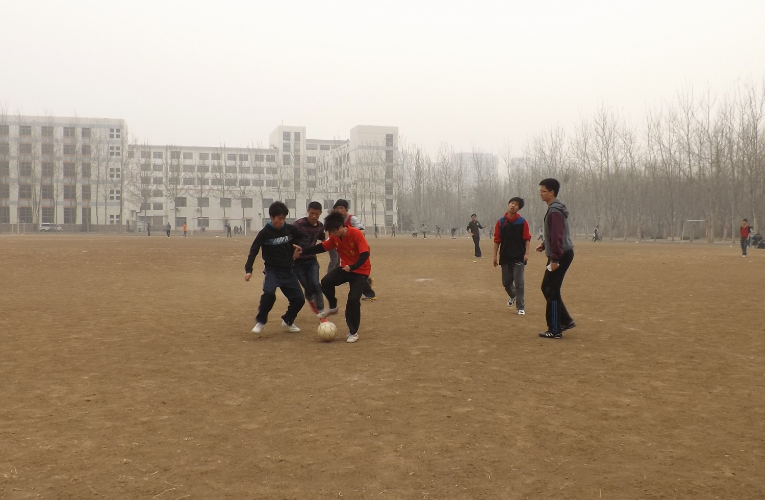 凛冽的寒风,漫天的灰尘,恶劣的环境丝毫挡不住参赛同学的热情。赛前,两队的队员积极做着准备活动,争取以最好的状态去迎接比赛。随着一声哨响,比赛正式开始。