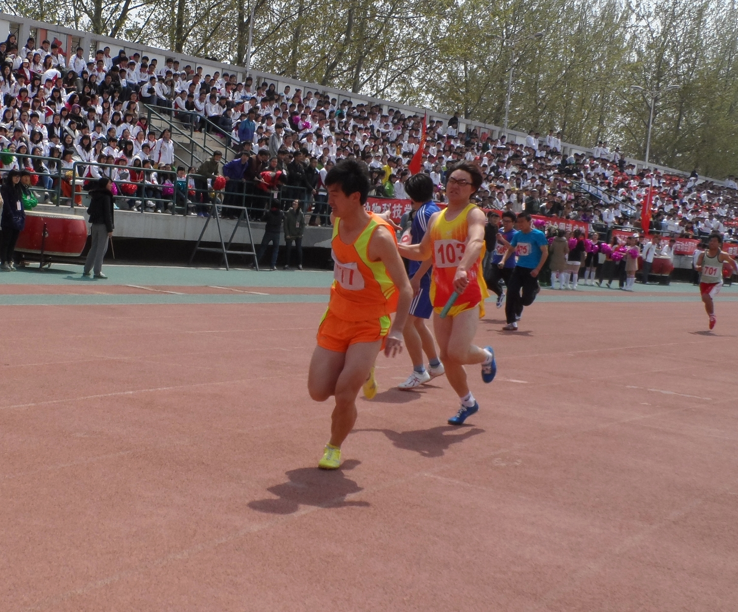 上午的男子800米决赛中,王可占和任雨龙同学严阵以待,他们眼神坚定,充满自信。两位运动员鼓足了劲儿摆动双臂,把全身力量转移到双腿上,咬紧牙关,奋力冲向终点。看台上的观众更是大声呐喊,为运动员加油。最终,王可占同学取得了第二名的好成绩,为我院赢得一枚银牌。下午的男子200米决赛中,我院参赛运动员是101号张健同学和103号丛佳同学,发令枪响后,我院两位选手犹如离弦之箭,在激烈的竞争中毫不退缩,奋力向前飞奔,矫健的身姿流露出速度与霸气,最终张健和丛佳分别以23”43和24”06的佳绩夺取冠军和季军;在男子400米栏的决赛中,我院选手王可占表现也相当不俗,赛前他做着热身运动,调整状态,比赛一开始,他箭步冲出,奋勇争先,奋力跨过一道道栏冲向终点,最终取得第四名的好成绩;最能体现我院团结精神的当属男子4*400米决赛,我院全体同学的加油呐喊声仿佛是他们不竭的力量源泉,随着发令枪响,运动员们开始了真正的较量,面对其他强劲的对手,我院的四位选手毫不退缩,尽自己最大的努力去拼搏,虽然最后没有取得理想的名次,但他们勇于挑战自我的勇气却在这运动赛场上留下了闪亮的一笔。