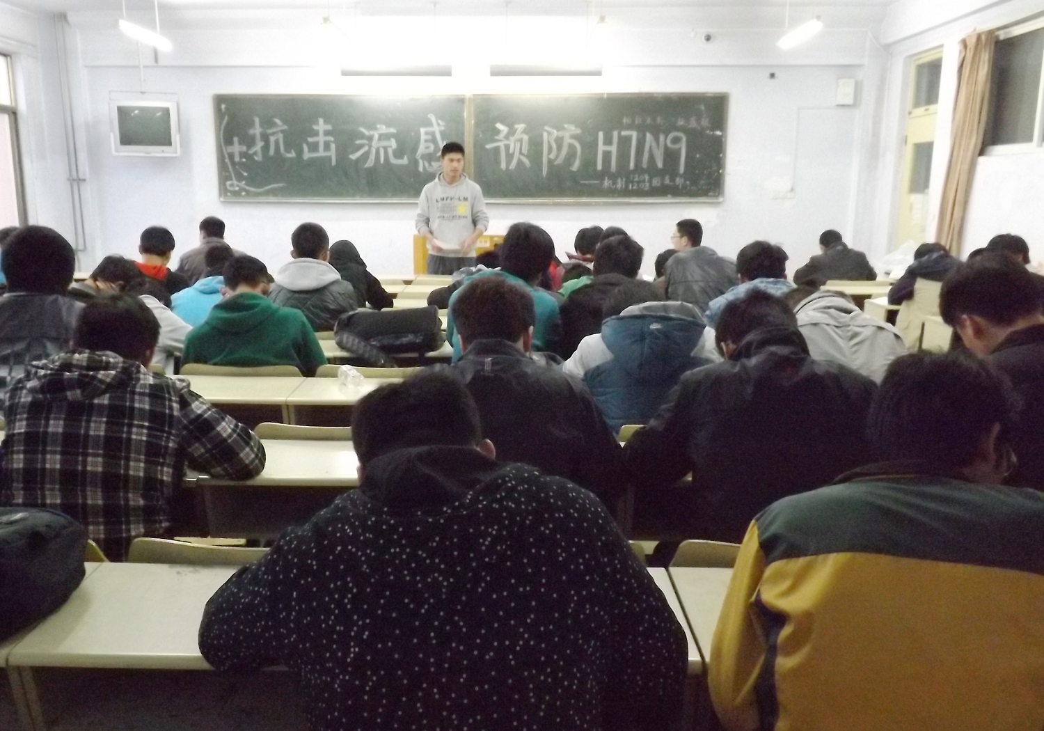 团课上,各班的团支书详细的讲解了此次H7N9禽流感疫情的发病状况,并就如何预防提出了以下几点建议:(1)吃熟食,不吃生鸡蛋。(2)注意避免接触禽、畜。(3)勤洗手、室内勤通风换气、注意营养,保持室内清洁。(4)若有发热及呼吸道症状,应戴上口罩,尽快就诊等等。同时还指出提高自身抵抗力是抗击流感的根本,建议同学们加强体育锻炼,增强身体素质。之后,同学们就此进行了讨论,并表示要在课余时间进行体育锻炼,做好各种预防措施。