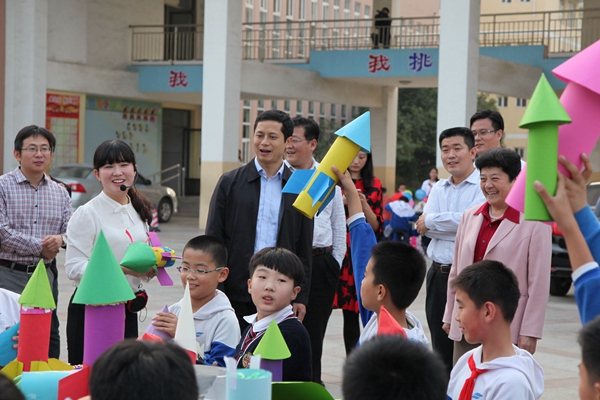 “小小科学家”公益圈成员在志愿服务基地为小学生开展了六节“科技课堂”——“鸡蛋撞地球”、水火箭、自制“万花筒”、无动力小车、纸桥承重和手掷飞行翼,王明学依次参观各个课堂,对我校与城阳区第二实验小学的合作成果表示肯定。课堂上,各公益圈成员通过有趣、形象的科学现象,与孩子们共同完成科技小发明、小制作,孩子们积极与公益圈成员进行互动,发挥想象力、不断发问“为什么”,现场气氛热烈。王明学也参与到课堂中,观看课堂创作成果,并对孩子们的想象力和动手能力表示赞赏和欣慰。
