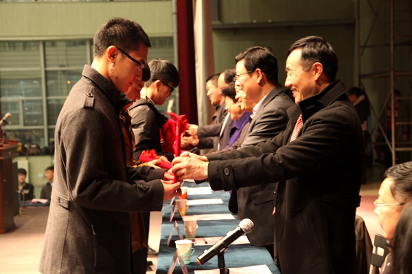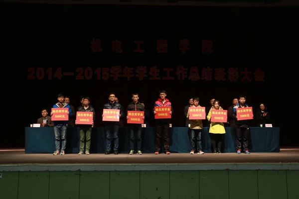 国歌奏响,大会开幕。机电工程学院党委书记蒋金琳向同学们做了《机电工程学院2014-2015学年学生工作总结报告》,他从思想政治建设、学风建设、科技创新、社会实践四个方面详细分析了我院一学年里工作的成就和不足:在过去的一年里,我院获评“2014年度学生工作先进集体”、“2014年度学生工作特色与品牌创建工作先进学院”,学院分团委被授予“山东省五四红旗团委”荣誉称号。蒋书记指出:今后学院工作会以学生成长成才为中心,全力做好毕业生就业工作。随后,机电工程学院院长尚书旗宣读《关于表彰2014-2015学年度先进集体、先进个人的决定》和《关于授予张翔同学“章鼓”奖学金的决定》后,各位与会领导为先进集体、优秀学生干部以及各类奖学金获得者颁奖。