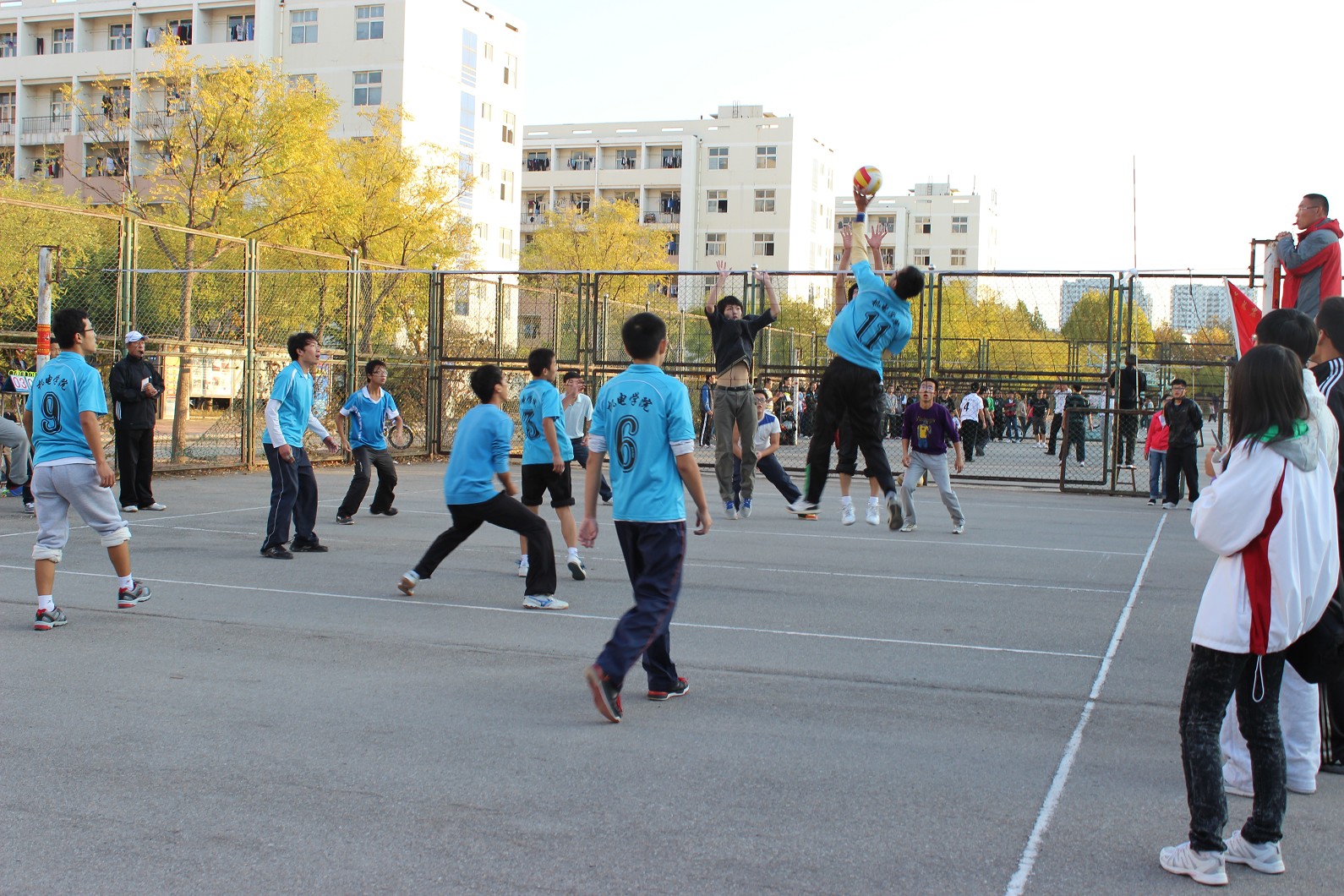 10月30日下午,男排比赛八强循环赛在排球场继续进行,此战我院的对手是农植保学院。天气虽冷但队员的斗志和观众的热情却丝毫不减。