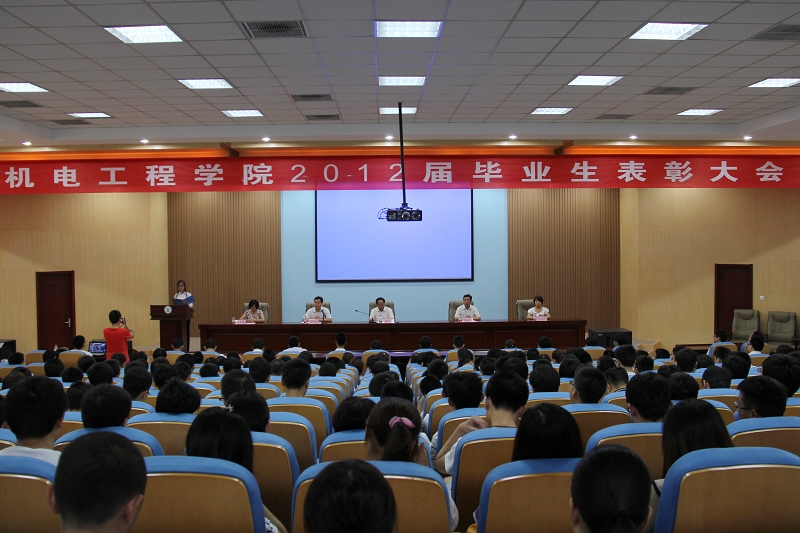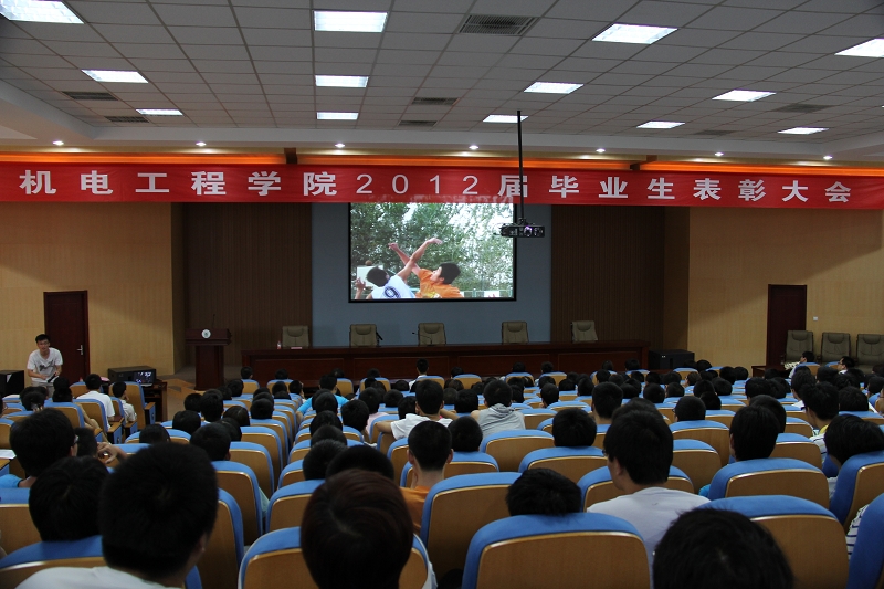大会在嘹亮的国歌声中拉开序幕。蒋金琳书记宣读了本年度受表彰的先进集体和先进个人名单。尚书旗院长在会上致辞,他指出机电工程学院是一个具有光荣传统的学院,有着良好的教风、学风和浓郁的育人氛围,一直以来都是学校发展的中坚力量,学院将继续保持这种良好的发展势头,为社会培养更多的人才。他高度评价了2012届的毕业生,并启发同学们要对自己的人生和职业生涯进行规划,在激烈的就业竞争中保持冷静的心态,在工作中体现自身的价值。