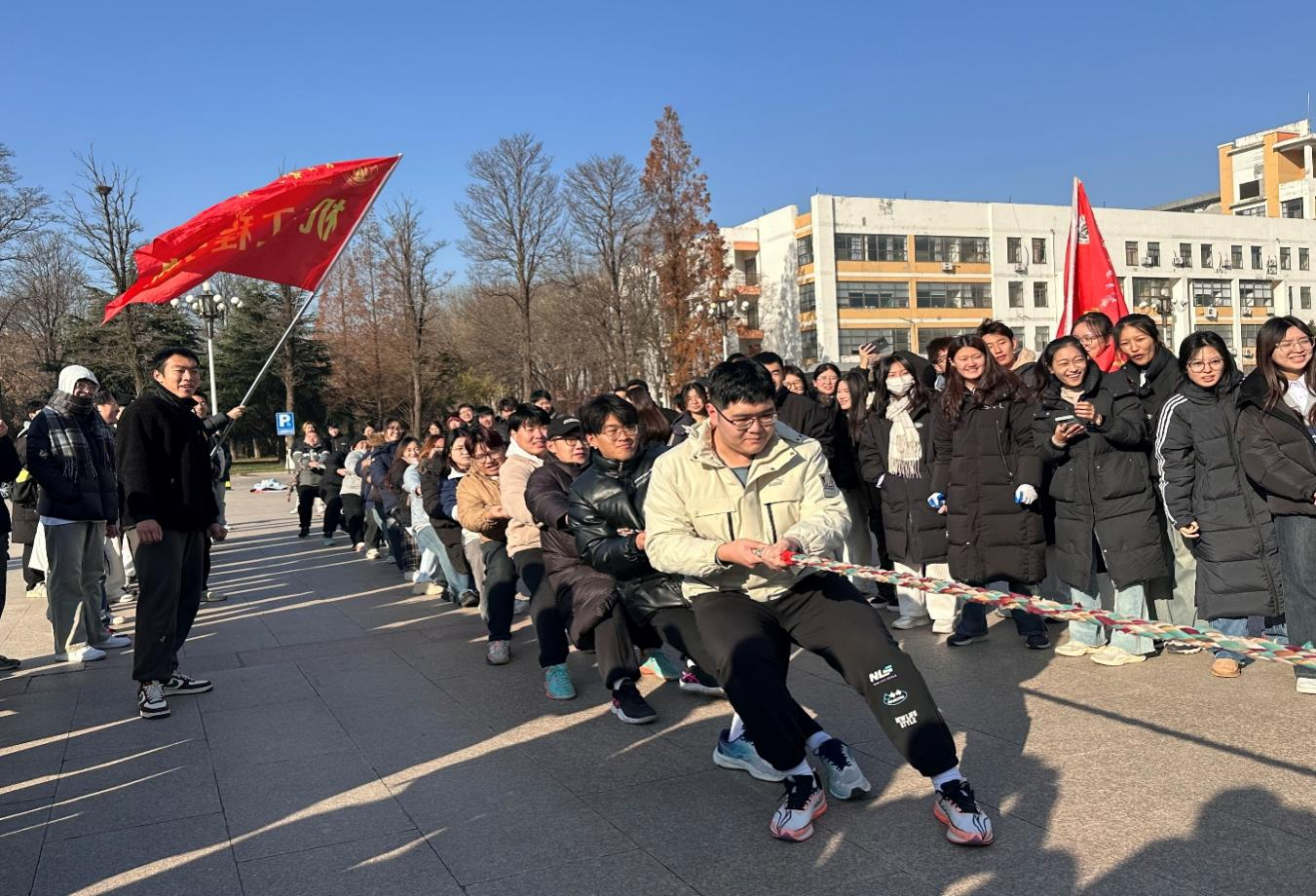 冬意渐浓,虹子广场却热闹非凡。比赛开始前,队员们认真地进行热身运动,活动筋骨,调整状态,为即将到来的比赛做足准备。随着裁判一声哨响,比赛正式开始。队员们迅速紧握麻绳,身体后倾,双脚如同生了根一般牢牢蹬地,齐声呼喊着口号,齐心协力地用力拉绳。比赛中,战况激烈。队员们齐心协力,将比赛推向高潮。一旁的观众们也不甘示弱,他们热情高涨地为自己支持的队伍呐喊助威。“加油!加油!”的呼喊声此起彼伏,仿佛要冲破云霄。最终,机电工程学院代表队凭借顽强的毅力和强大的团队力量,赢得了比赛。
