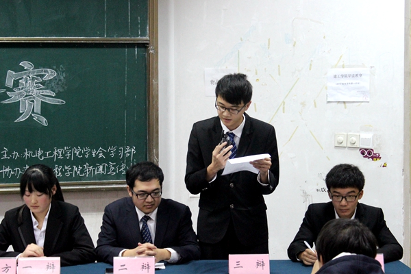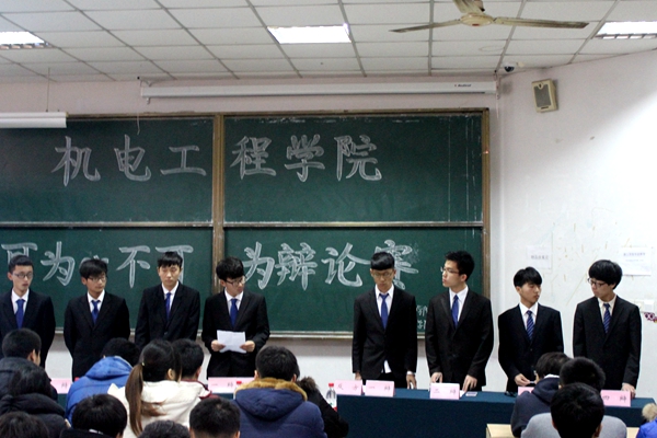 12月20日,由机电工程学院学习部主办、新闻宣传中心协办的以“可为or不可为”为论点的辩论赛在教学区拉开战幕。比赛面向15级各专业,每个专业组成一支代表队,共有6支队伍参加了本次比赛。比赛由常增村、王铮、陈宝雨、杨康、张德军担任评委,队伍上场顺序由赛前抽签决定。