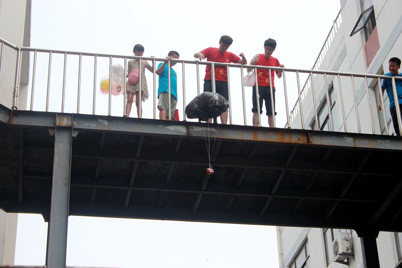 当站在高处的队员将一个个准备好的鸡蛋开始往下放的时候,所有的小朋友都目不转睛地看着即将抛下的鸡蛋。有的小朋友不仅把三角架做的很牢固,鸡蛋也用胶带包了好几层,如此悉心的“照顾”,鸡蛋掉在地上时完好无缺;有的小朋友准备可能并不充分,小降落伞还没打开,鸡蛋就掉在地上摔碎了。小朋友中也随之欢呼雀跃或是满脸沮丧。