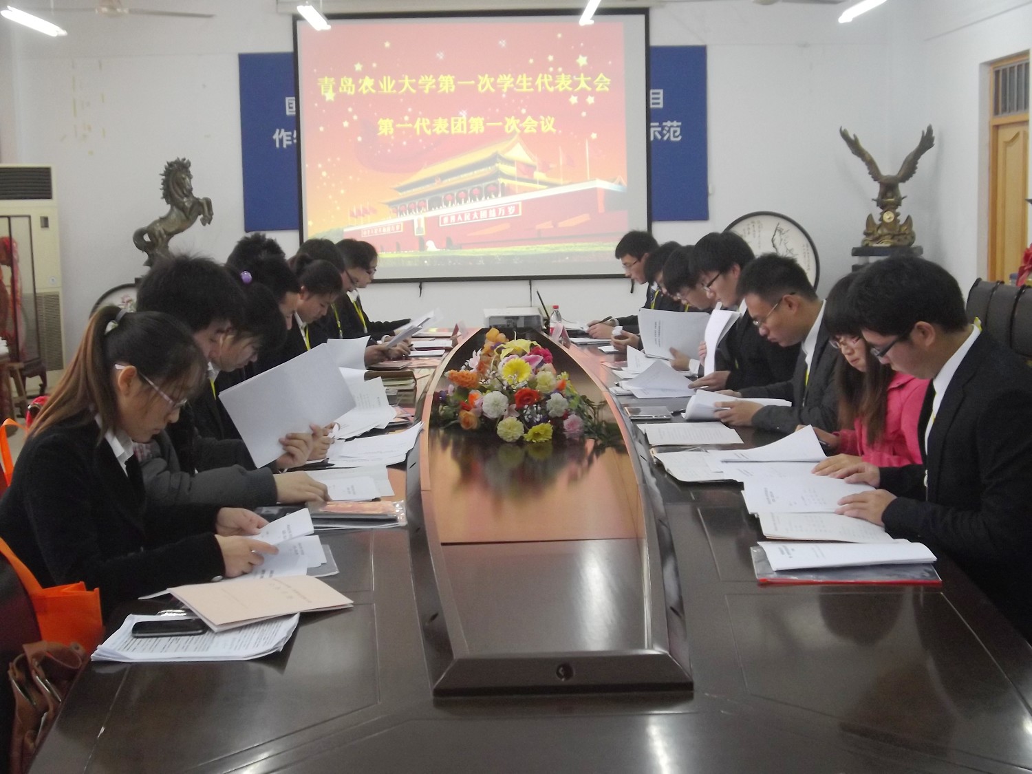 首先崔金永在会议上向学生代表们传达了各选举单位召集人会议内容。而后学生代表们经过相互讨论,举手表决的形式选举出大会第一代表团的团长、副团长分别是崔金永和刘晓庚。另外,《大会议程(草案)》、《大会主席团成员名单(草案)》、《大会秘书长、副秘书长名单(草案)》、《大会总监票人、监票人名单(草案)》、《大会总计票人、计票人(草案)》、《大会代表资格审查报告(草案)》、《青岛农业大学第一届学生委员会委员选举办法(草案)》、《青岛农业大学第一届学生委员会委员候选人建议名单》都通过学生代表们讨论后举手表决的方式决定,最终会议上的所有文件都全票通过。会议期间,学生代表们积极讨论、勇敢表决会议气氛融洽。