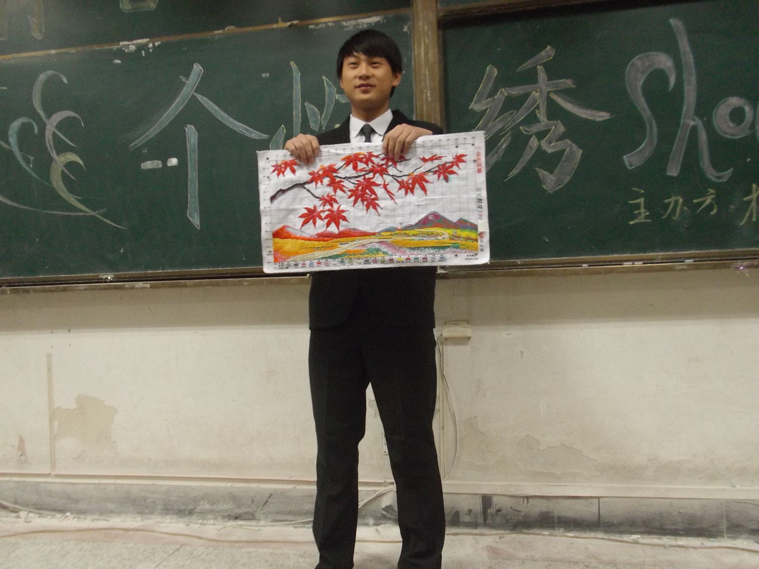 主持人介绍完活动规则后,各班参赛选手依次上台展现自己的作品并进行作品创作讲解,另外,各班的现场才艺也为活动增添了些许色彩。火红的枫叶灼灼燃烧,温暖的围巾T台走秀,唯美的扇子舞,精彩的歌曲演唱和相声表演赢来了观众的一阵阵掌声。二胡独奏,双节棍的精彩表演等节目更是将比赛推到高潮。一幅幅同学们自己绘出的美丽图案,培养了同学们的美的观念。