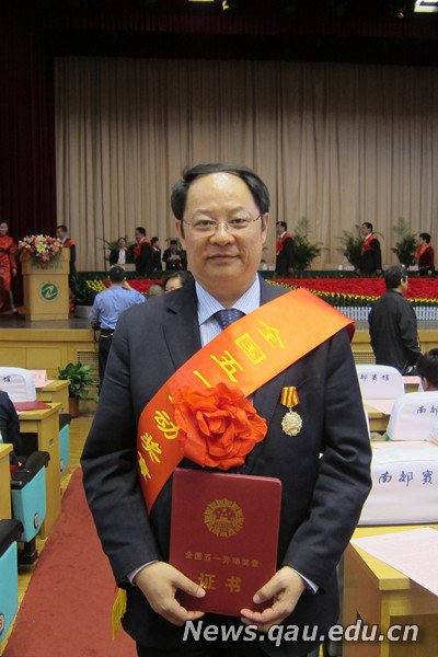 4月26日下午,山东省庆祝“五一”国际劳动节暨富民兴鲁劳动奖章(状)获得者表彰大会在济南举行,青岛农业大学机电工程学院院长尚书旗教授在会上受表彰,获得全国五一劳动奖章。