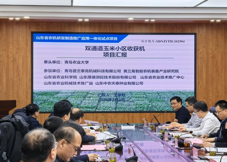2026年2月3日,山东省农机研发制造推广应用一体化试点项目“双通道玉米小区收获机”启动会在青岛农业大学机电工程学院会议室召开。该项目由青岛农业大学牵头承担,青岛普兰泰克机械科技有限公司等四家单位协同参与。国内相关领域行业专家、山东省农业农村厅分管领导以及项目组成员出席本次会议。