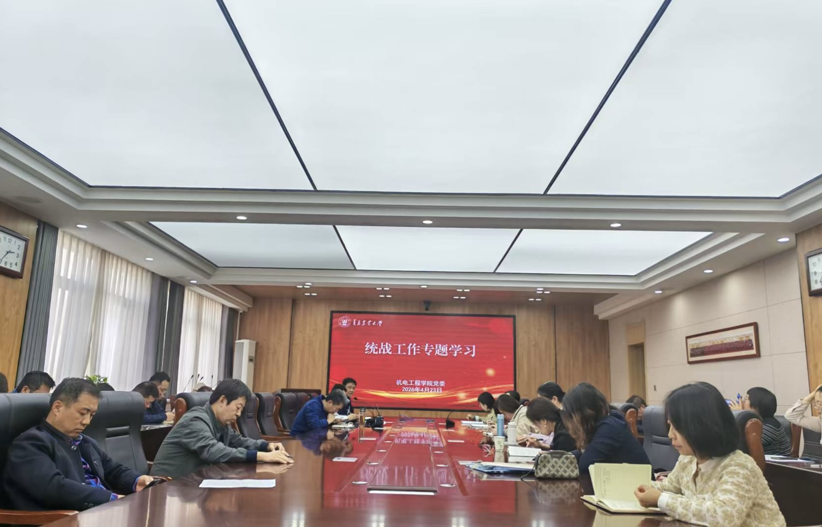 4月23日,机电工程学院召开全体教职工理论学习会议,深入学习统一战线工作专题,会议由学院党委副书记、副院长刘凝主持,全体教职工参加。